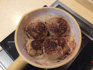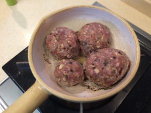 土鍋に火を掛けて、油をひと塗りしてかハンバーグタネを好きな大きさに整えて入れる。